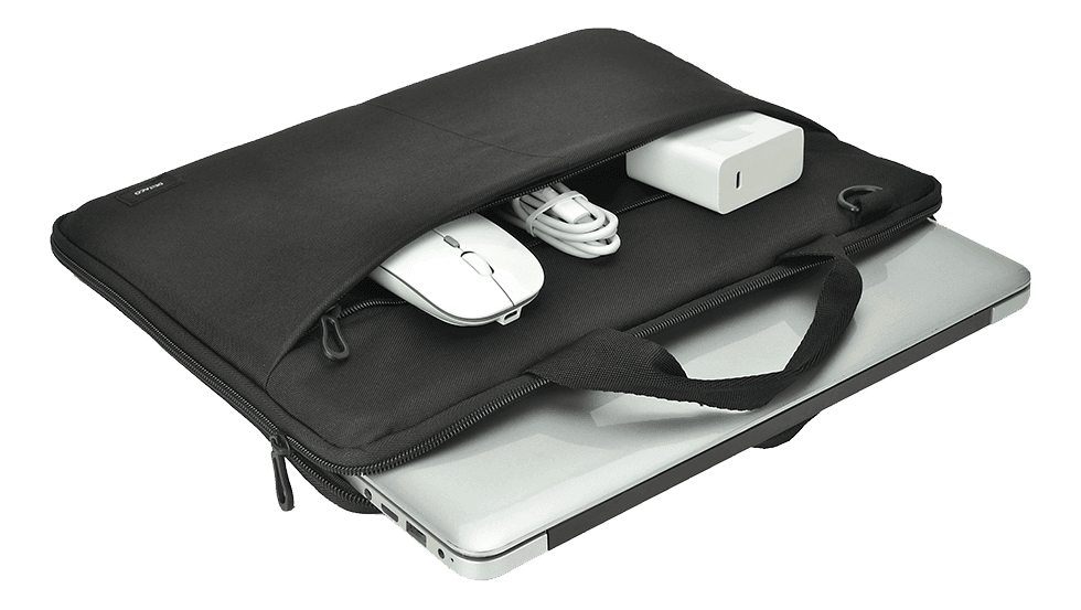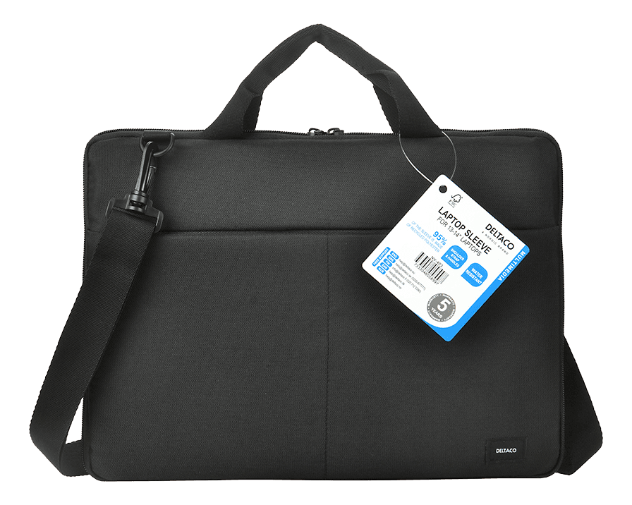 Stylish laptop sleeve for 13-14-inch laptops. The case is made of 95% recycled material, has a snug fit with padding to protect against scratches and bumps, and has durable handles and a shoulder strap for easy transportation, ideal for commuting or longer trips. With convenient mounts on the inside and a separate front pocket for chargers, you take your organization to a new level.