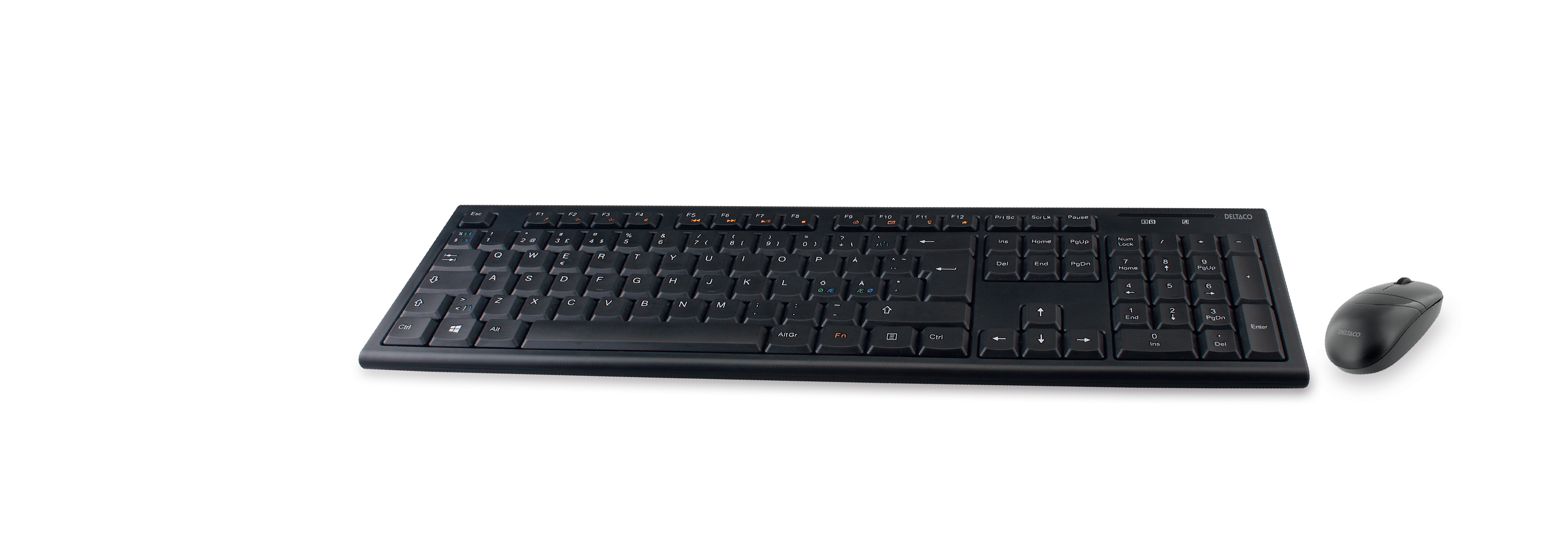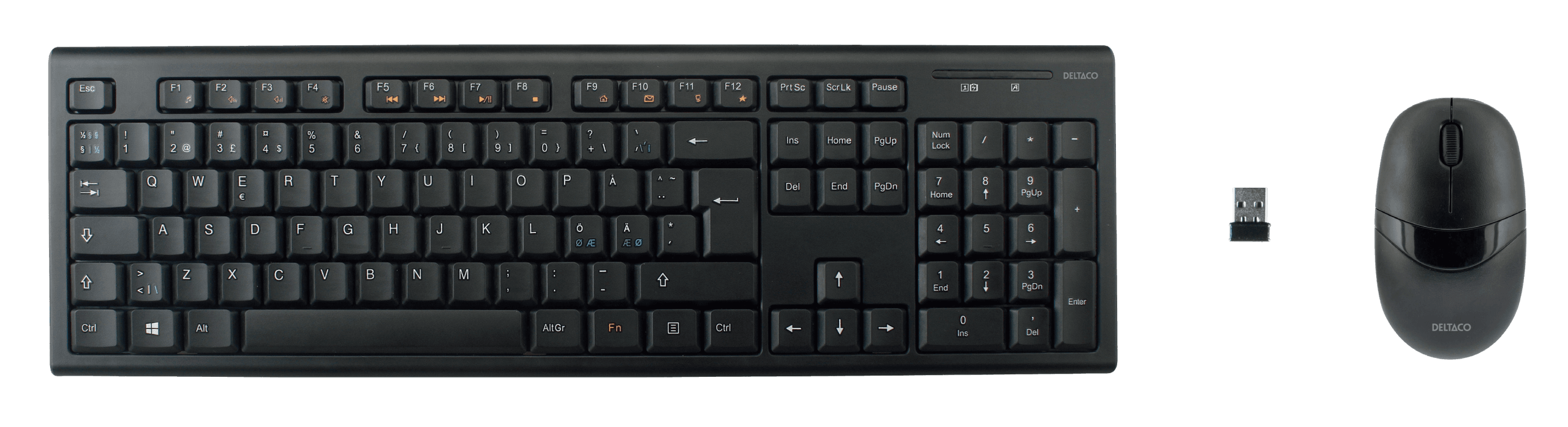 Trådløst tastatur og mus, nordisk layout, USB nano-mottaker, 10m rekkevidde, svart